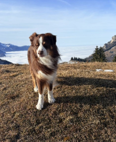 Er ist ein unauffälliger dunkler Rüde mit weißer Blesse, Kragen und Beinen. Außerdem hat er Kupferanteile.